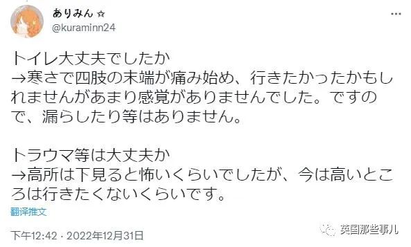 “关于上厕所的问题,我当时已经冷到四肢末端都开始痛了,即便身体或许想要上厕所,但是我已经没什么感觉了,所以也没有在上面漏尿。至于会不会因此留下阴影什么的,我之前害怕从高处往下看,现在应该是不想登高的程度吧。”