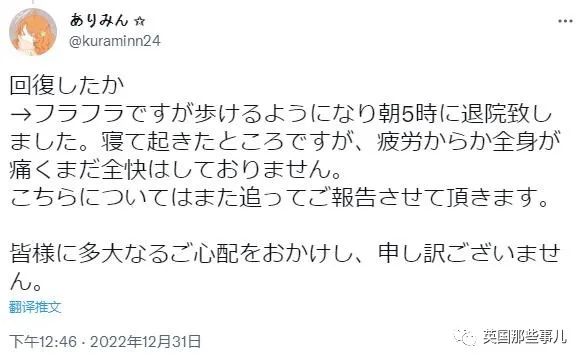 “我也是恢复到可以自行走路,但是还有点摇摇晃晃的程度,就在第二天早上5点出院了。虽然睡了一觉,但或许是疲惫,全身的痛感还没有完全消失。日后再和大家交流,抱歉让大家担心了。”