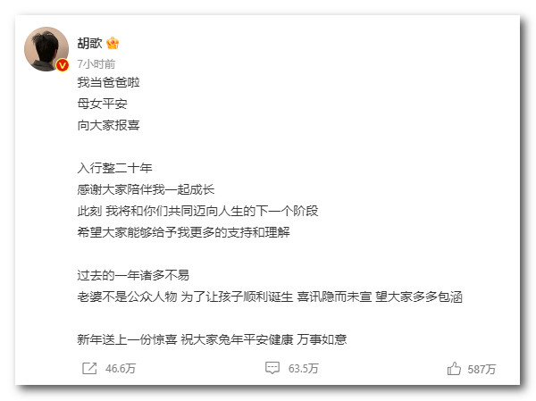 有着7000多万粉丝的演员胡歌今天在微博发文,宣布自己已经当爸爸了。同时表示妻子不是公众人物,为了让孩子顺利诞生,喜讯隐而未宣,望大家多多包涵。