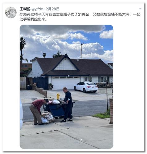 3月1日, 一位刚移居到美国的网络用户在社交平台分享动态,表示获得了当地居民孙海英老师的帮助。当时孙海英老师带着他去卖空瓶子,卖了21美金,然后又教其垃圾桶不能填满,于是便一起动手捡出来。