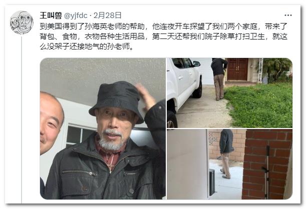2月28日之前,该网友便晒出其动态,表示刚到美国就获得了孙海英老师的帮助,送来了背包,食物,衣物等还各种生活用品。第二天还帮助打扫卫生,赞扬其没架子接地气,之后便晒出多张照片。