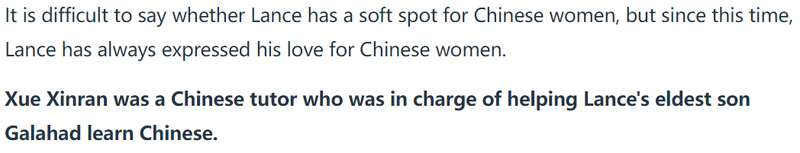 Lance的第一任妻子Helga Hoffman 是一位家庭治疗师,俩人相伴40年感情很深,但妻子不幸因病去世,两人育有四个孩子。之后,他又迷恋上了他给大儿子请的中文老师薛欣然(音译),这位老师知性又温柔,她经常在课后与Lance聊天,鼓励他振作起来。