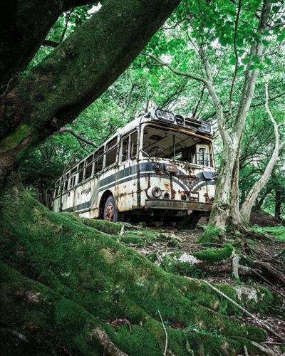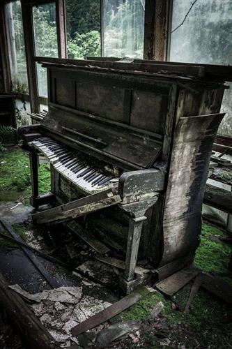 他就是致力于“废墟写真”的日本摄影师Toshibo。在他的镜头下,危房、“鬼屋”、荒废的发电厂、满是苔藓的钢琴、藤蔓遍布的空中楼阁,应有尽有。他最喜欢探索那些人迹罕至的地方,用一幅幅照片无声地讲述一个个被现代文明遗忘的、苍老又浪漫的故事。他新奇的视角受到众多粉丝的欢迎,网友纷纷评价:“这该死的末日浪漫,简直无人能及!”我们先来看个唯美系的。这废旧钢琴的键盘一定被什么重物物理超度过,一排整齐的键盘牙齿被打弯,下巴似的键盘托也掉了。然而,这却巧妙锻造了S型的优美弧度,如荒废的流动乐章,仿佛就等着谁来发现。