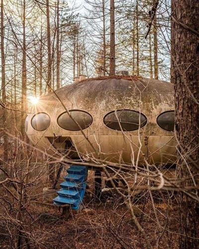 再来个科幻系的。荒野一日游,漫步丛林见,日落黄昏晓,飞盘在眼前。这赛博朋克的UFO竟然开着门,甚至伸出了鲜艳蓝色的登机梯!实在是太魔幻了。