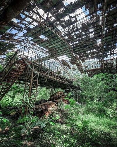 这废旧工厂残破的天花板和残留钢铁骨架也颇为壮观。