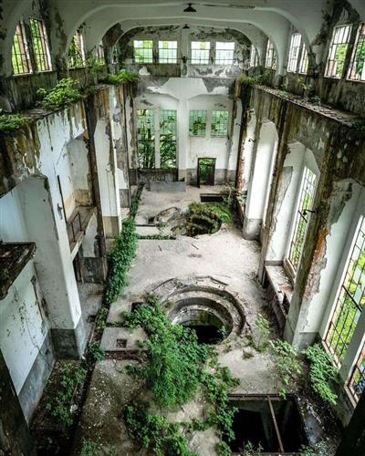 一处教堂构造的废旧发电厂,已被苔藓和藤蔓攻占。