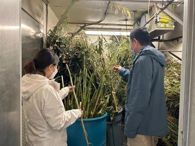 北京动物园工作人员正在检查“丫丫”食用的竹子 (4月12日摄)