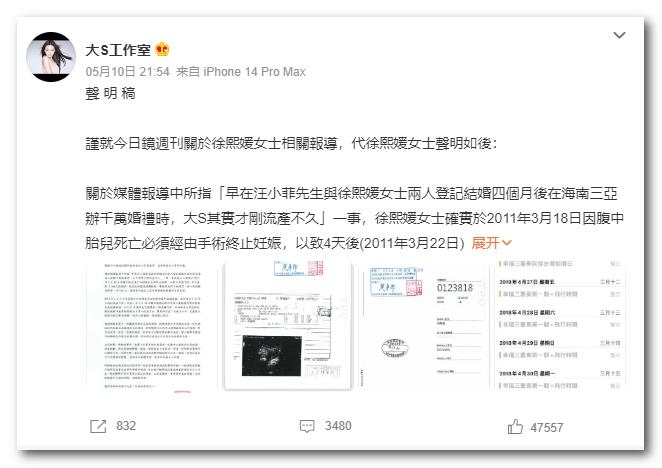 5月10日,大S工作室就网传大S不止1次流产再发声明,表示大S曾于2011年与汪小菲婚礼前流产一次、在2018年4月再次流产,并在流产后一周开始了《幸福三重奏》的拍摄。