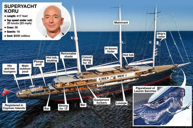 几天前,贝索斯带着桑切斯乘坐着直升飞机,降落在了名为“Koru号”的新游艇上,开始了他们的奢华假期。这艘配备有两个游泳池的游艇,耗时5年建造完成,拥有约217米长的船身和70米高的桅杆。而因为桅杆也是游艇的一部分,所以“Koru号”也被认定为是世界上最高的游艇。普遍认为,这艘游艇是贝索斯为表达对女友的一往情深而打造的,因为在船头处有一个木头雕刻的女子全身像,和桑切斯看上去很是相似。