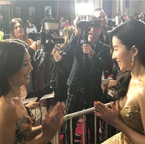 和刘亦菲的红毯合影。两代木兰的惺惺相惜,太过美好的画面: