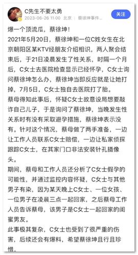 爆料的知情人把整个事件说的十分清晰,还放出了事件女主人公C女士,手拿打胎档案的照片,并且有媒体扒出,爆料者说的时间线,跟蔡徐坤活动的时间线是吻合的,更加证实了这个瓜的真实性。