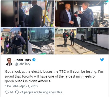 多伦多将在明年使用全新的全电动公交车,为多伦多成为北美首屈一指的环保城市作出表率,预计将耗资5000万元。首批投入使用的30辆可充电的公交车将于2019年3月之前就位。