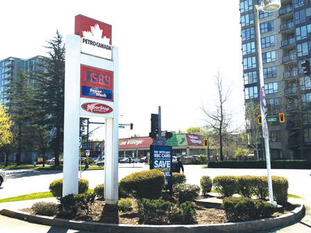 汽油价再创新高,列治文一油站昨日一度出现每公升158.9仙。(本报记者摄)