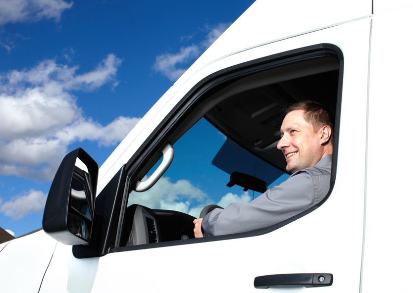 Smiling truck driver in the car. Delivery cargo service.[/caption]