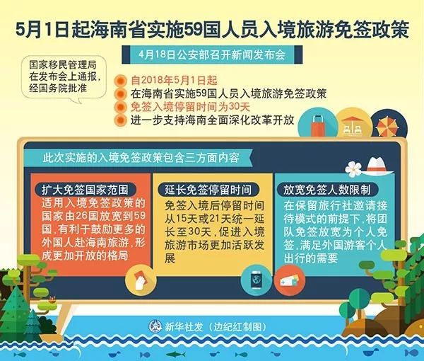 经国务院批准,自5月1日起,在海南省实施59国人员入境免签政策,增加了33个国家名额,免签入境后停留时间由15天或21天统一延长至30天。此外,还放宽免签人数限制,在保留旅行社邀请接待模式的前提下,将团队免签放宽为个人免签,满足外国游客个人出行的需要。