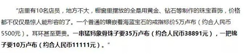 根据俄罗斯《共青团真理报》曝光,一名俄罗斯大妈向记者披露,自己住的地方有几个商店和其他的商铺都不一样,这些商店是首饰品商店,每天,都会有十几辆中国大巴车开到商店门口,从上面走下来很多中国游客,进入商店买东西,而当大妈自己想进入珠宝店逛一逛时,居然被门口保安给拦下来了!