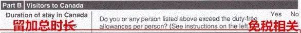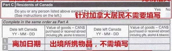 Do you or any person listed above exceedthe exemptions per person? — (See instructions on the left.) — 你或表格中的任何人有没携带超过个人免税额度的物品?(参看申报卡左边的说明)每位加拿大居民的免税额度是根据其离开加拿大的时间来确定的。离境少于24小时无免税额;离境24小时而不超过48小时:200加币;离境超过48小时:800加币。如果回中国后带了自己用过的物品回加拿大,就不用算在额度之内。额度的计算只包括居民在离境期间购买或者被赠与的物品。