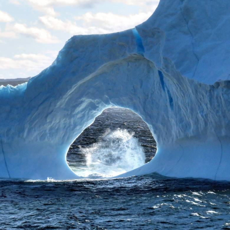 这个漂移到加拿大纽芬兰省博纳维斯塔半岛近海的冰山有91.4米高,更加难得的是冰山中部接触海水的部位形成一个马蹄形的大洞;再配上海浪拍打冰山出现的白色浪花、岸边的松树和草地深浅不同的绿色和远处天空的蓝天白云,美得真是如仙境一般。