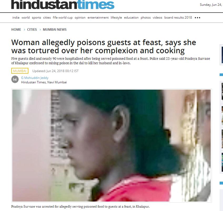 印度孟买一23岁女子苏瓦西(Pradnya Survase)长期受丈夫家冷嘲热讽,导致她选择了报复,其在亲友的喜宴上下毒,结果造成88人送医治疗,其中5人死亡,包括一名53岁成人及4名儿童。