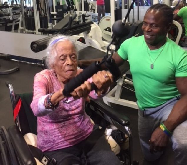 温尼伯市的瓦伦丁健身房有一个特殊的会员,96岁的克莱门茨老太太(Winnie Clements)。虽然老人出门要靠轮椅,但这并不妨碍她每个星期来两次,用哑铃和器械做各种肌肉练习。她的教练佩恩(Valentine Payne)也是这家健身房的业主。他说,他当教练已经四十年了,从来没有教过年纪这么大的学生。