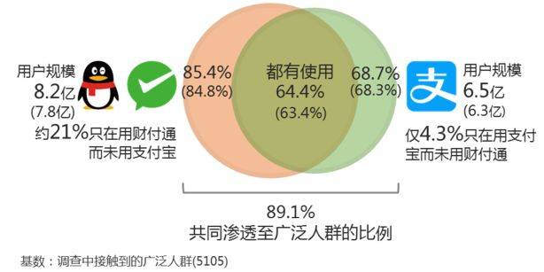 由调查数据推算,财付通和支付宝的用户规模分别达到8.2亿和6.5亿,与2017年11月调查相比,分别增长了0.4亿和0.3亿。财付通和支付宝的共同使用率为64.4%,支付宝用户几乎也都在用财付通旗下的微信支付和手机QQ钱包,而约21%的财付通用户并未使用支付宝。
