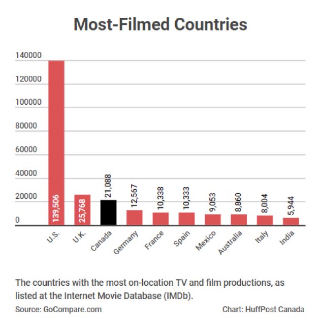 事实上,数据也显示加拿大是IMDb数据库中影视作品取景量排名第三的国家,仅次于美国和英国。