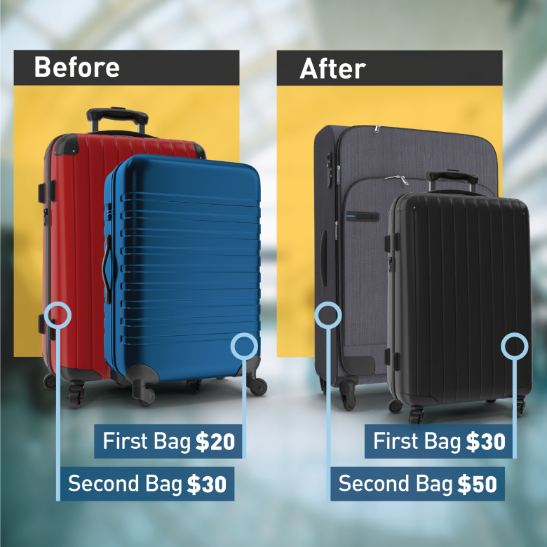 加拿大的这两家最大的航空公司把第一件托运行李的费用从25 加元提高到 30 加元,把第二件托运行李的费用从30 加元提高到 50 加元。