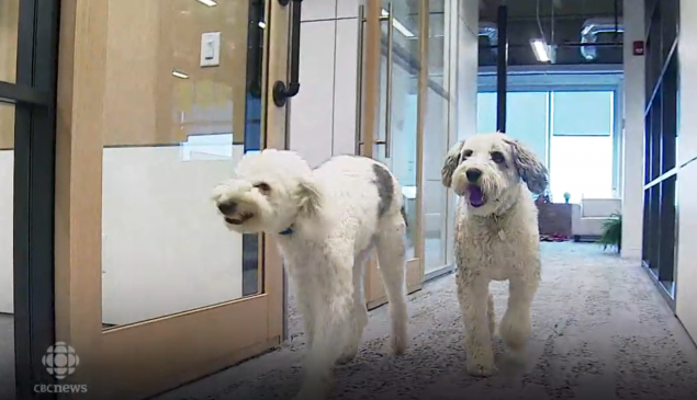 加拿大广播公司报道了卡尔加里市高科技公司Benevity在十年前创立时就开始实行雇员可以带宠物狗和宠物猫上班的政策所带来的积极效果。