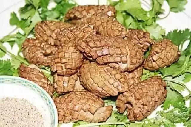 那道著名的炸核桃腰,是选用上好的猪腰切成长方形的小块,表面纵横,用立刀解十字花刀划出纹路,然后下油锅炸之。这时候的油要热而不沸,炸到变黄,腰块缩卷成圆形,刀口绽开,成核桃状,故名核桃腰。炸到金黄的核桃腰趁热蘸花椒盐食用,一时脆嫩利口,不软不硬,椒香满口。