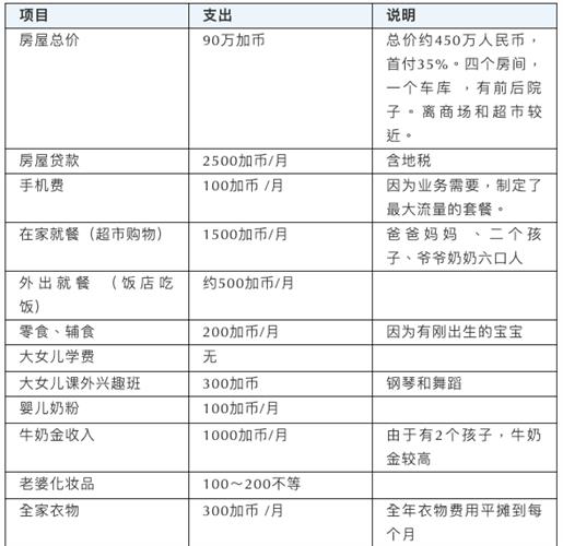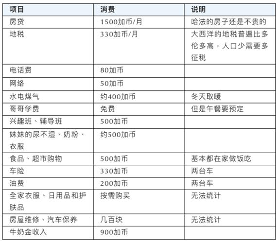 在大西洋享受自由的妈妈 由于AIPP项目的火爆,很多中国人第一次听说了大西洋四省。其实它是由四个小省份组成,NS、NB、PEI和纽芬兰。其中最大的城市算是NS省的哈利法克斯了,但是人口也只有四十万。可能还没有你们老家的小县城人多。不过大家也不要误会,在加拿大无论你是在多伦多这种大城市,还是像在哈法、温尼伯这种小城市,生活设施、教育水平不会有太大差别,环境更是没得说。但在就业方面差距还是会比较大。再有就是晚上看不到什么人。 小林一家在哈法生活了二年多,有二个可爱的宝宝,也有自己的一套房子。上个月他们全家消费情况统计大致如下: