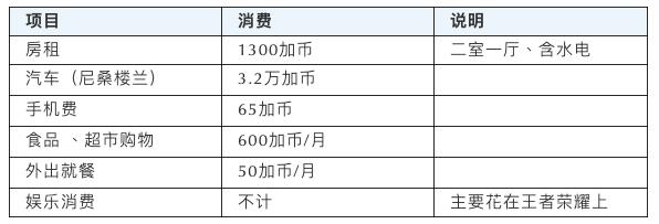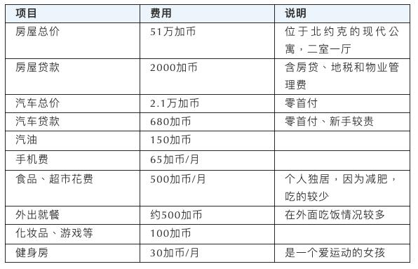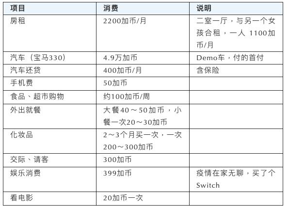 此外,为了方便对比,我也找了一位在温哥华的单身女孩小赵。让大家横向对比一下,无房贷、无孩子的生活情况。