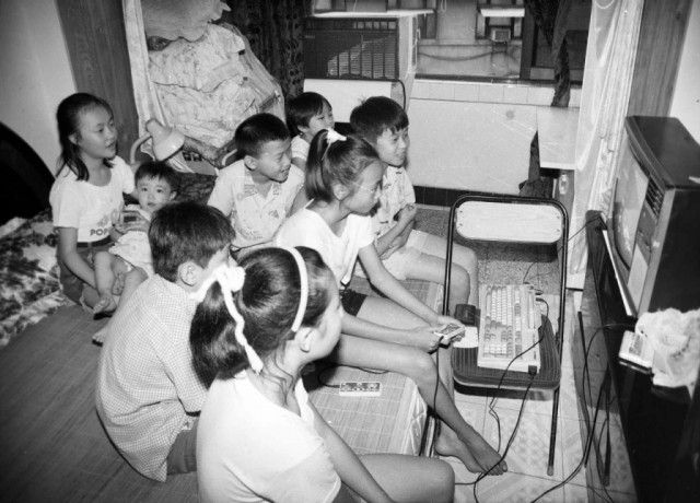 1993 年 8 月,重庆市渝中区蒲草田街,在放假的日子,孩子们围在电视机前用当时流行的小霸王播卡游戏机兴致勃勃地玩电子游戏。罗大万/摄影