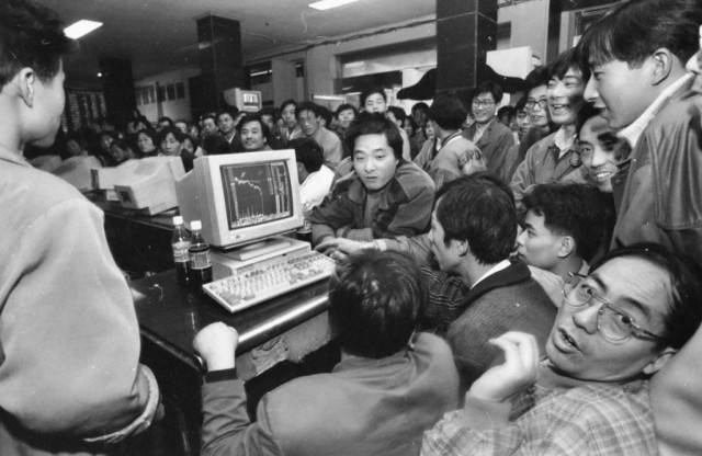 1993 年,浙江杭州,股票市场初期,大户也是几十个人共用一台电脑。摄影/潘良干
