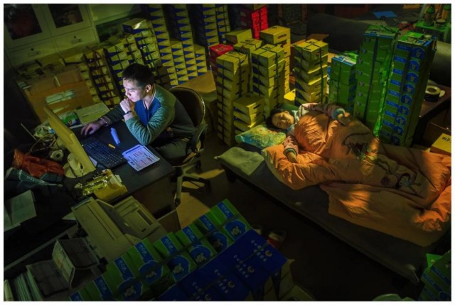 2014 年,浙江温州,凌晨还在打理电商业务的夫妇。摄影/赵用