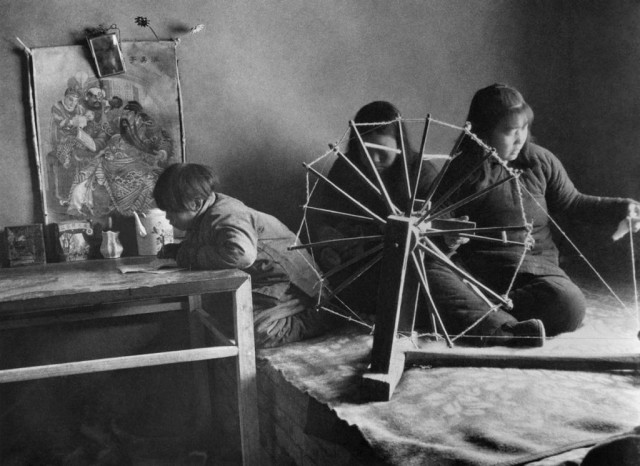 1943 年,河北,在地道洞口纺纱。摄影/石少华