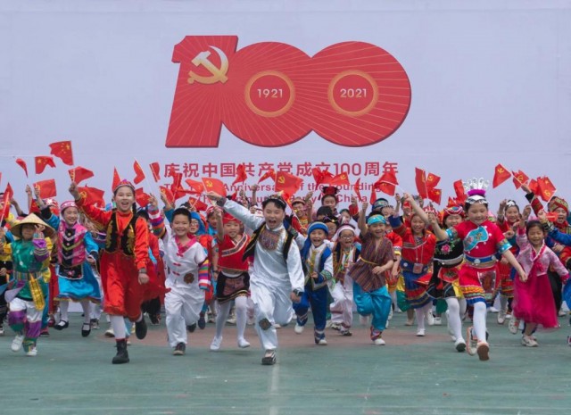 2021 年,四川南充,参加中国共产党成立 100 周年主题活动的孩子们。摄影/彭圣洲