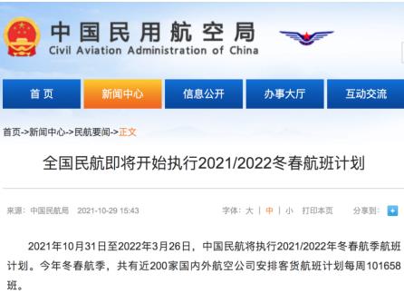 上周五(10月29日),中国民航总局宣布,从2021年10月31日至2022年3月26日,将执行2021/2022年冬春航季航班计划。