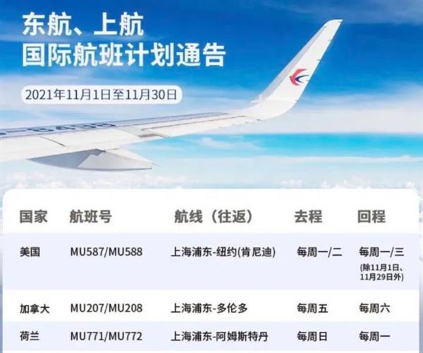 东航宣布,上海浦东至多伦多的MU207、MU208航班,每周去程周五,回程为周六。
