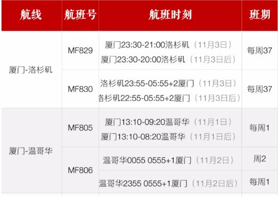 厦门往返温哥华的MF805、MF806航班较之前有所调整,调整后,每周的去程和回程时间均为周一。
