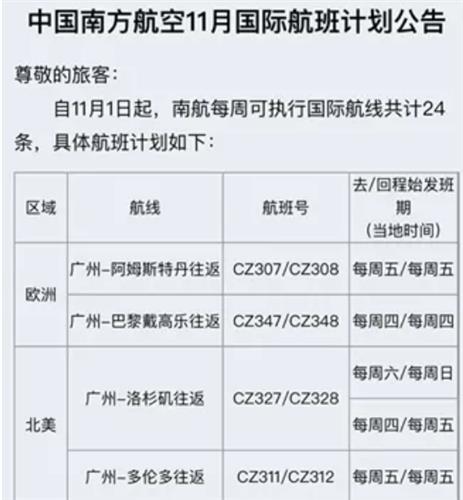 南航广州往返多伦多的CA311、CZ312航班,11月之后每周的去程和回程均为周五。