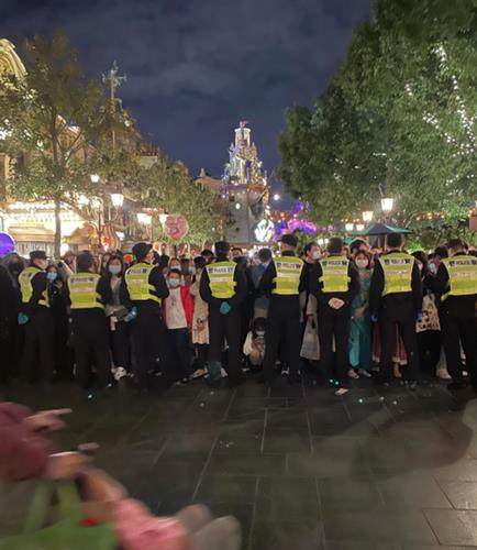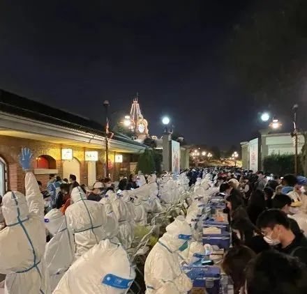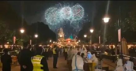 当晚比较温馨的一幕是,虽然迪士尼了关闭部分室内项目,但户外演出仍继续演出。大家一边排队检测核酸一边欣赏万圣节烟花。