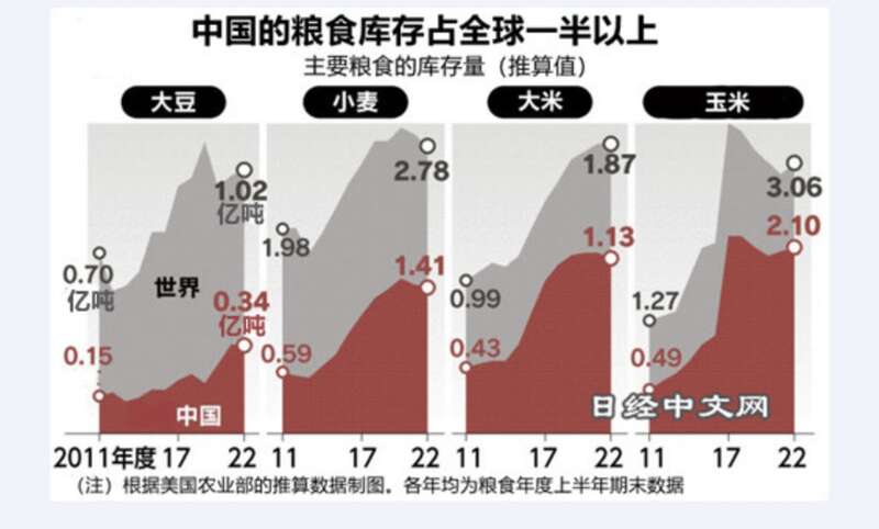 据日本媒体引述美国农业部统计报导,中国储备的玉米等主要粮食库存量达全球的一半以上。由于中国人口不到全球的两成,有观点认为,这是全球粮食价格走高和饥饿问题的原因之一。在中国东北地区辽宁省大连市,数量约310座的巨大圆筒在港口一字排开,这是国有粮食大型企业中粮集团所有的中国最大规模粮食仓库(筒仓)。从国内外采购的大豆等都储备在此处,通过铁路或船舶运往全国各地。