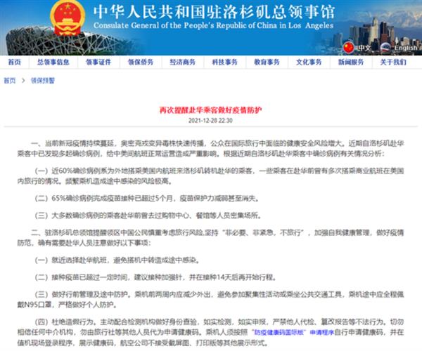 如果入境中国时也被查出阳性,不仅要隔离,还要被送去医学观察,时间和金钱成本都会增加,飞机上其他人也要跟着一起做检查。一位网友说自己家里探亲老人等了两年了,最近终于订好了机票回去,结果没想到赶上了最近航班不稳定,让她觉得特别无奈。与此同时,中国驻洛杉矶总领事馆在12月28日发布声明,再次提醒赴华乘客做好疫情防护。