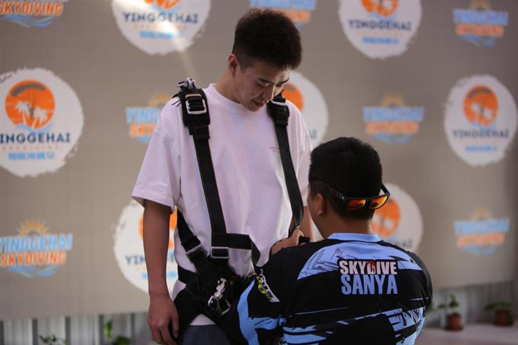 3月15日,乐东莺歌海游客在教练帮助下穿戴跳伞装备。新华社记者樊雨晴 摄