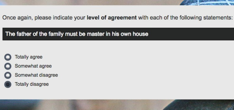 比如有的问题要求她就“移民在损害加拿大的社会构成”、“大自然让男性比女性更优秀”、“异性结婚并生儿育女组成家庭才是人间正道”等价值判断进行打分,打分的范围从非常同意到坚决不同意。
