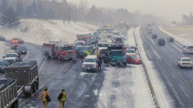 安大略省警方说,下雪天气和路面上的冰雪是造成这一高速公路汽车连环相撞事故的主要原因。