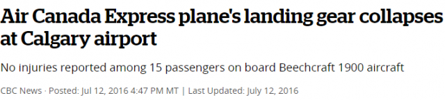 当时该架加航AC7212航班由Lethbridge飞往卡尔加里,在卡尔加里国际机场降落触地时,前起落架破损。飞机上共有15名乘客,他们是从飞机正常出口下机,由巴士转送至登机口。 (据加国无忧)