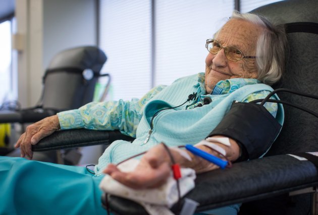 “肯定的,直到我100岁,今年八月份我就96岁了。”Janyk周三在温哥华加拿大血液服务中心捐献血液之前告诉记者说。她在那里被确认为加拿大年龄最大的献血者。