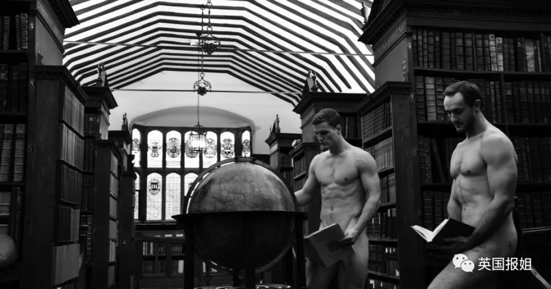 (图源:Telegraph) Okay,既然剑桥都脱了,那我们牛津也脱,不能输! 第二年,牛津大学60几位不同专业的学生们,也来了一套全裸的慈善拍摄。 图书馆