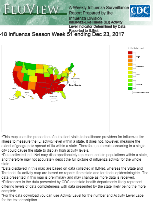 图示上周的流感统计数据,红色的州为流感高发的地区。其中较为严重的包括加州、德州、南卡、伊利诺伊州等。